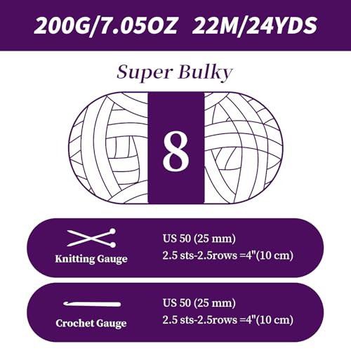 Each set contains 10 rolls of chunky yarn. Each roll is 24 yds/22 m long, with a thickness of 0.78 in/2cm and a weight of 7.05 oz/200 g. Recommended needles or hooks are 20-25mm.