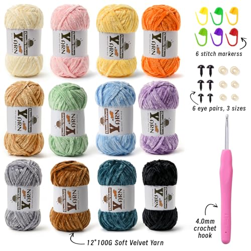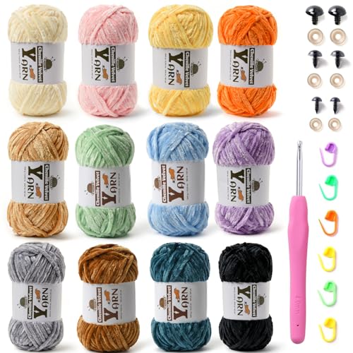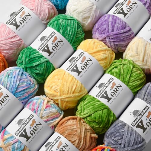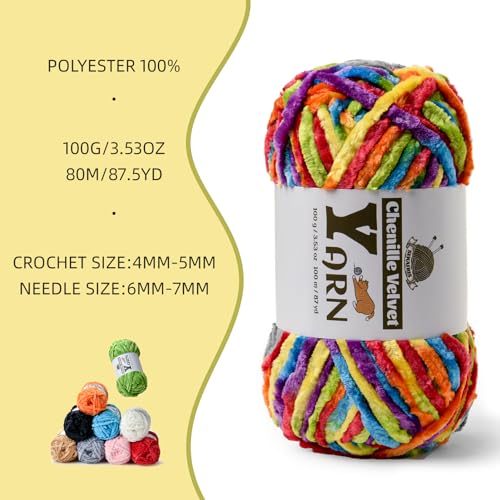 12 Pack Multicolor Fluffy Chunky Chenille Yarn for Crocheting Soft Amigurumi Yarn Set B | Fuzzy Velvet 12 Pack Multi