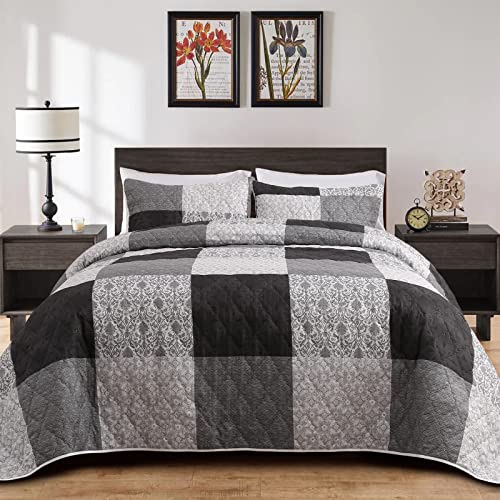 OVERSIZED KING BEDSPREAD – Plaid Bedding Gray Black Patchwork Quilt Set