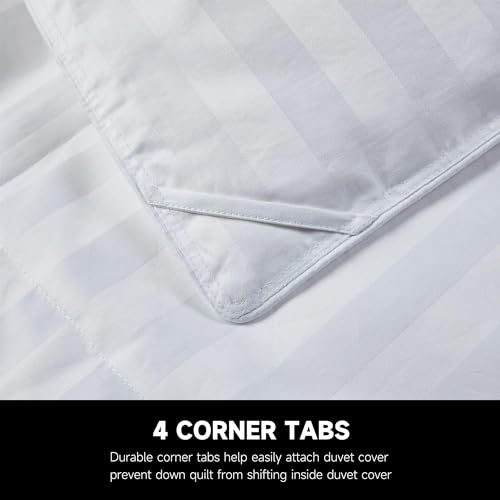 Our white goose down comforter comes with 4 corner tabs, making it easy to secure with the duvet cover and preventing shifting. We offer different sizes: Twin (68″x90″), Queen (90″x98″), and King (108″x98″). Choose the right size for your needs.