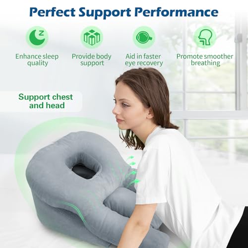 Our Ultimate After-Surgery Pillow features a uniquely designed hole that ensures a face-down position, essential for optimal healing after surgeries such as vitrectomy, macular hole repair, retinal detachment, and BBL (Bladder Body Lift) surgery.