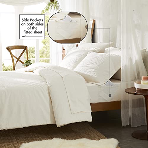 Adorn your bedroom with sophistication and elegance. Our queen comforter is a unique chic seersucker with an elegant 3D botanical vine design. Coming in ivory white, the comforter, shams, sheets, and pillowcases match perfectly, offering a vibrant farmhouse style that blends fashion and abstract art. Perfectly complement your room decor and create a welcoming ambiance in your bedroom.