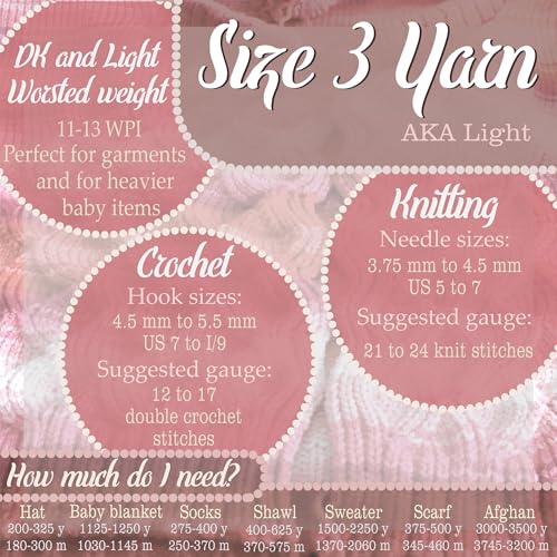This yarn falls under Category 3 – Light, also known as DK or light worsted weight. It’s perfect for creating cozy sweaters, lightweight blankets, and intricate lace patterns.