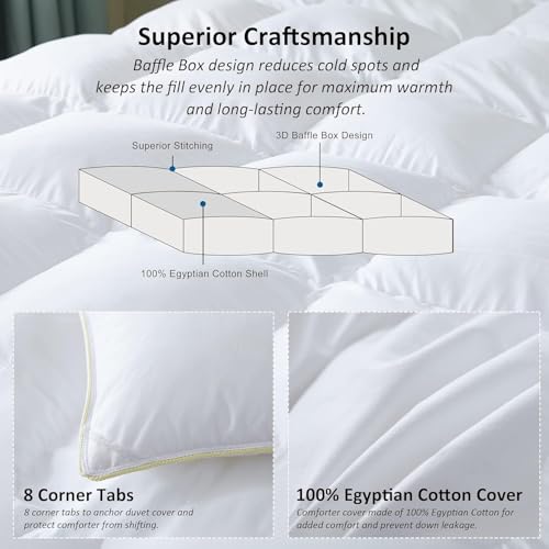 HIGH-Quality FILLING: Filled with 20% premium white goose down, 40% goose DownFiber, and 40% whole goose feathers, our comforter offers unmatched fluffiness and warmth. The white goose down is free from the unpleasant odor found in duck feathers. Its unique balance ensures warmth without being too heavy. The classic Box-stitch Quilting and down-proof treatment keep the filling evenly distributed, extending the comforter’s lifespan. Secure 8 corner tabs/ties for easy attachment to duvet covers.