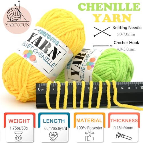 【Plush Chenille Yarn Size】Each roll of YARFOFUN’s velvet crochet yarn weighs approximately 50g (1.75 OZ) and measures 60m (65.6 yards) in length, with a thickness of 4mm (0.15 inches). For knitting, we recommend using a needle size of 6-7mm, and for crochet, a hook size of 4-5mm is ideal.