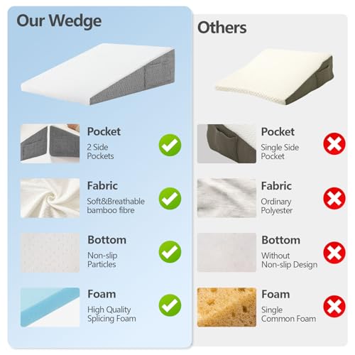 This triangle pillow for back pain relief comes with two different-oriented side pockets for storing your cell phone, glasses, or remote control. The portable handle allows for easy movement, whether you’re sitting up to read or watch TV. Additionally, the non-slip design at the bottom ensures stability. The handle also makes the pillow easy to carry.